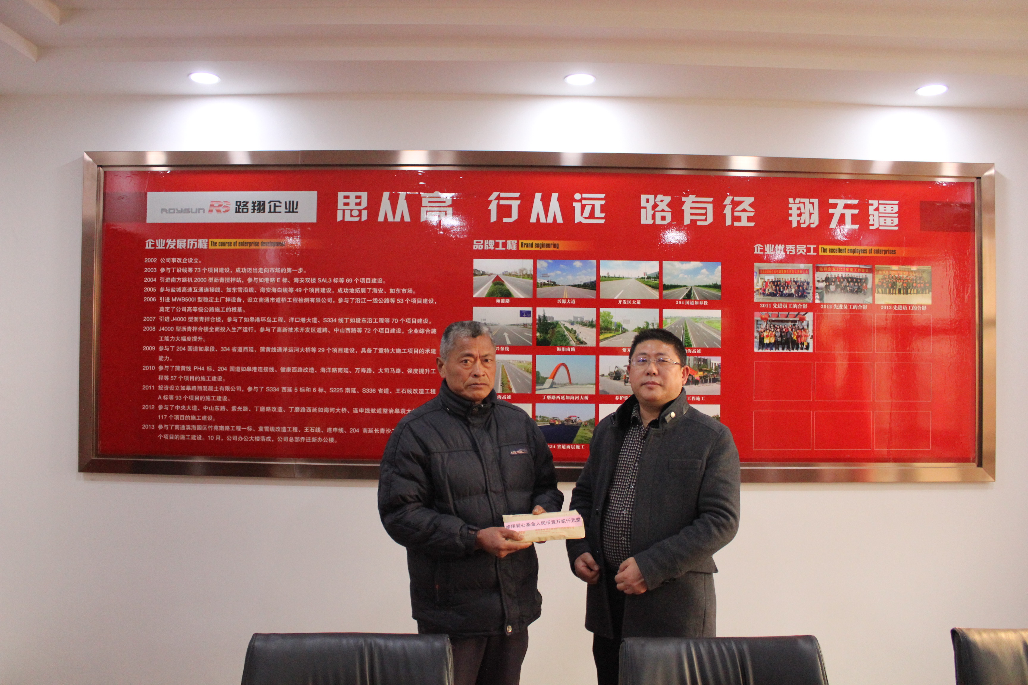 2014年12月,在市慈善基金會(huì)領(lǐng)導(dǎo)的關(guān)心和支持下,路翔企業(yè)發(fā)起成立了路翔愛心基金,專門用于本市地區(qū)性的扶貧助困、捐資助學(xué)、災(zāi)害救助、社區(qū)建設(shè)、傳統(tǒng)文化教育及其他慈善資助活動(dòng)。“路有徑、愛無疆、翔無涯”,我們堅(jiān)信:有了路翔愛心基金這個(gè)回饋社會(huì)的平臺(tái),路翔人一定會(huì)將愛的接力棒更好地傳承下去并發(fā)揚(yáng)光大。[總經(jīng)辦 朱洪鋼] |