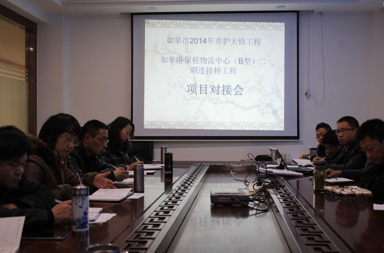 2015年3月28日下午5:00時,公司在本部二樓會議室召開了首批新開工項目對接會。會議由公司副總經理兼總工程師王兵主持,公司經營層領導、各部門主管、新開工項目管理團隊成員共18人與會。 會上,業務開發部部長成志軍首先介紹了如皋市2014年養護大修工程、如皋港保稅物流中心(B型)二期連接橋工程項目的情況、主要工程量、工期、項目部人員組成、公司管理模式;接著,各部門分別對項目管理提出了要求,項目部提出了一些需要協調解決的問題,王總就項目部與部門資源對接、對項目部千分制考核辦法等進行了說明。